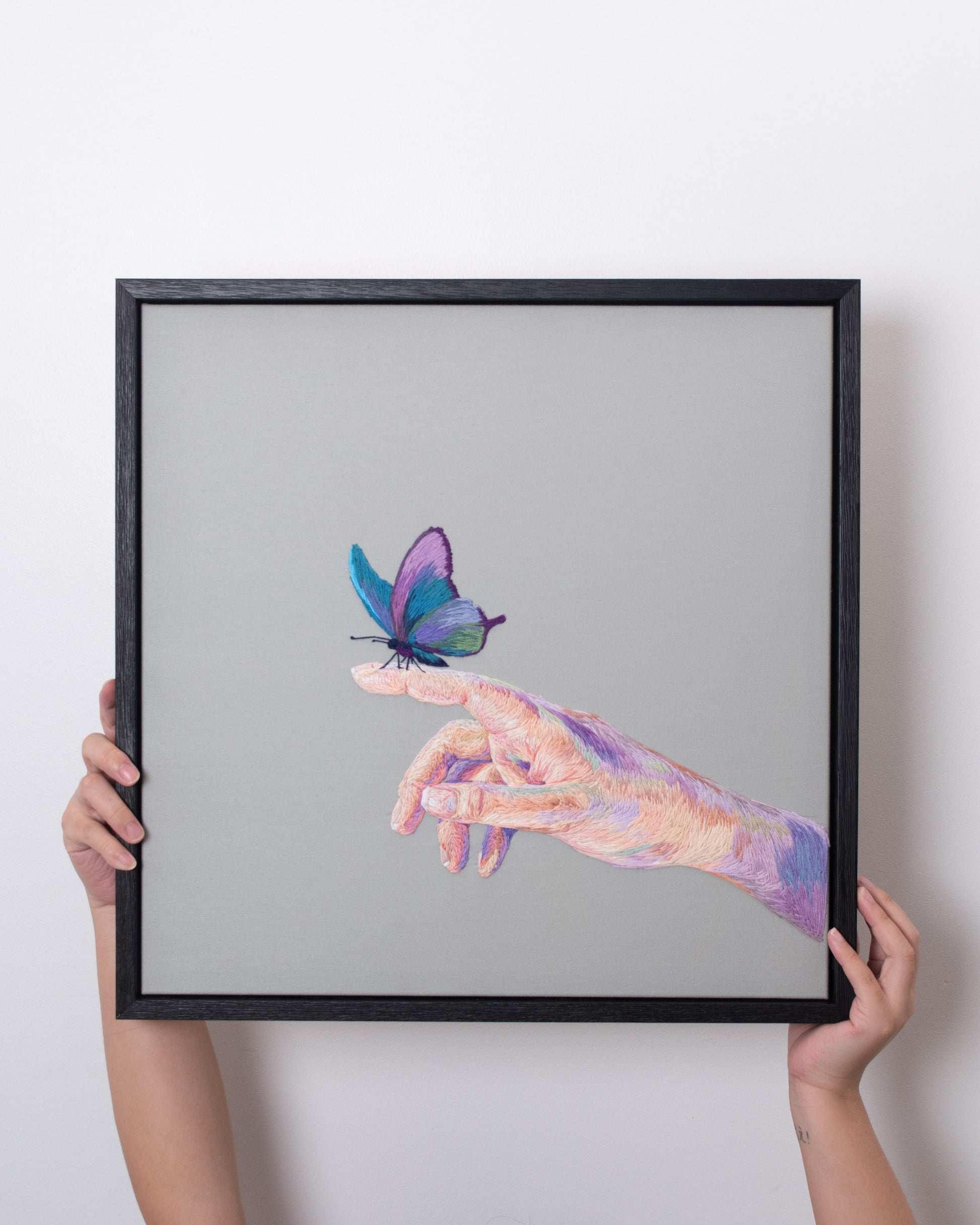 "The Moment" captures those cherished experiences, adding imagination to enhance or simplify them. Immerse yourself in the delicate artistry of our embroidered piece, showcasing a butterfly gracefully alighting on a human figure.